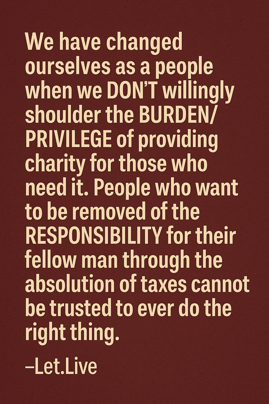 When people ask to be relieved of their obligations to their fellow man through systems that shift responsibility elsewhere, they reveal something deeper. Not just resistance to taxation—but resistance to care. And a society that trains itself to look away, or to leave it to someone else, cannot be trusted to protect the vulnerable when the system inevitably fails.