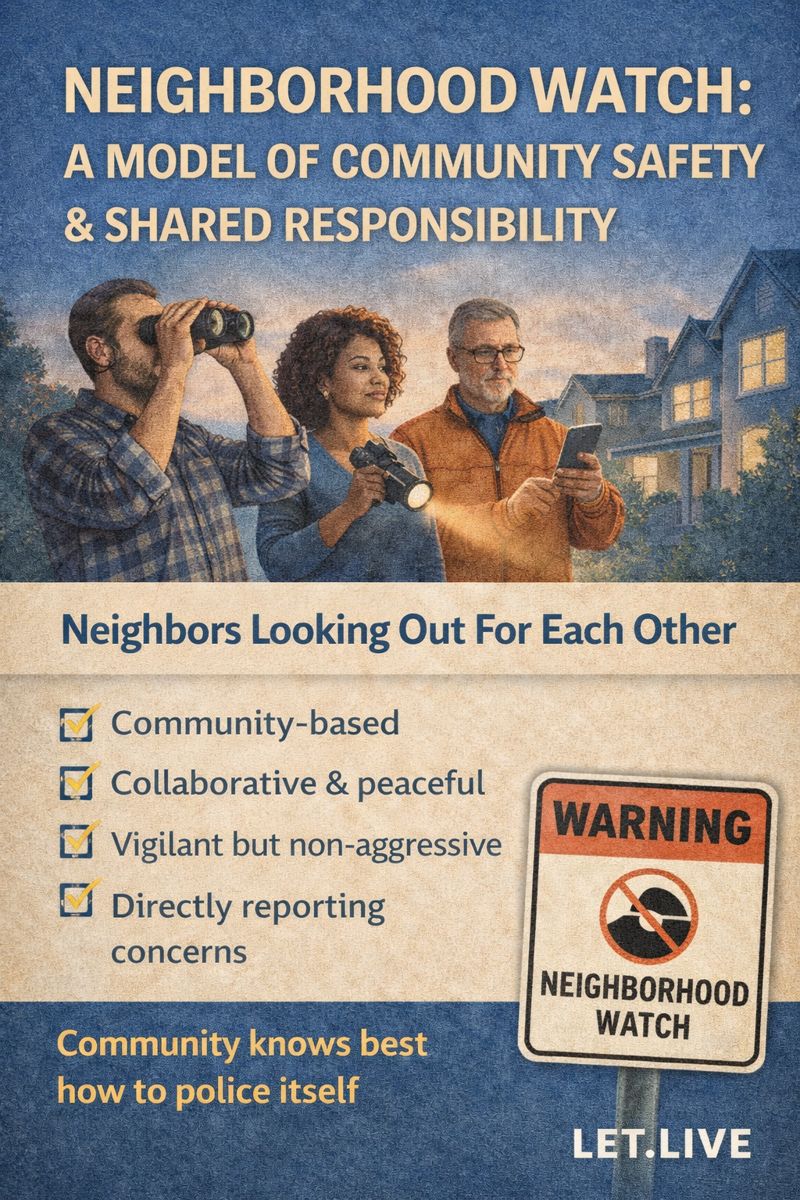 At Let.Live, we believe in decentralizing power away from coercive authority when possible and empowering individuals and communities to act responsibly together. A neighborhood watch is fundamentally different from vigilantism—it does not assume the right to arrest or punish, but does assume the responsibility to observe, report, assist, and communicate.